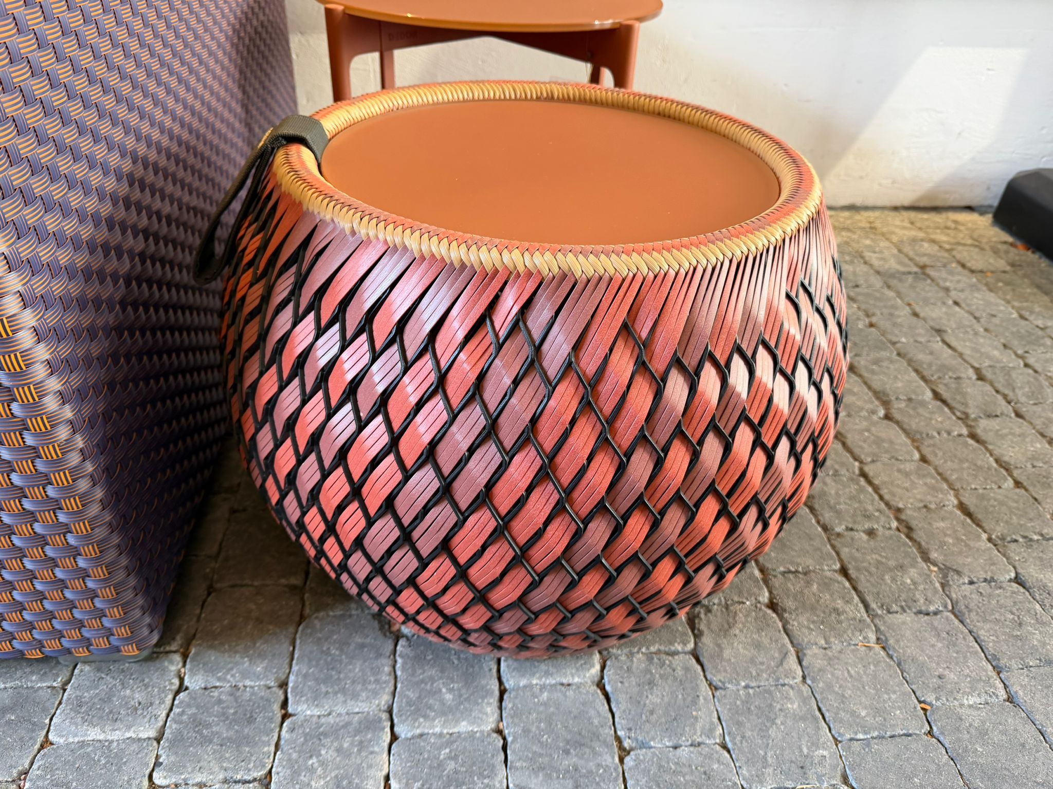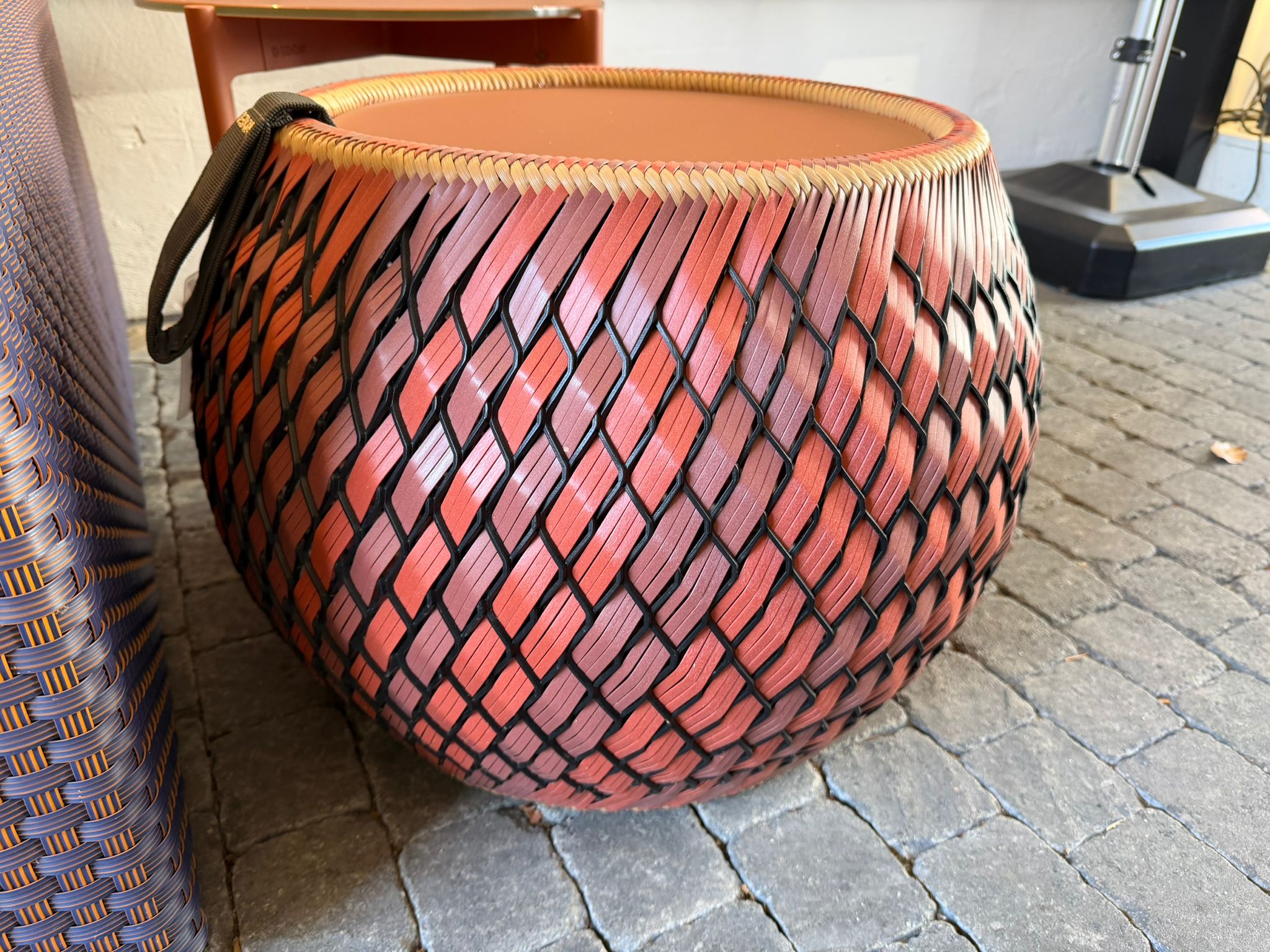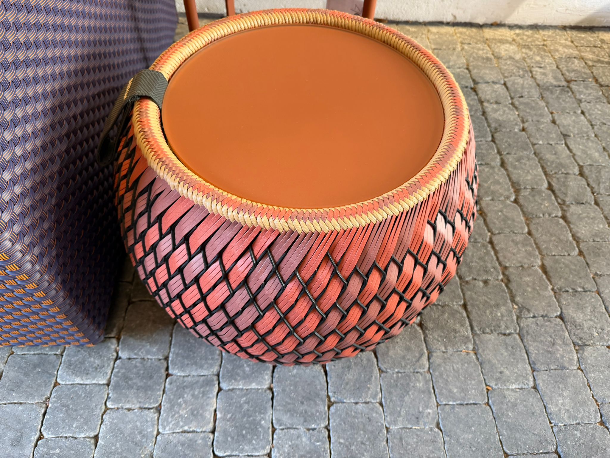 Der Beistelltisch DALA von DEDON besticht durch sein ausdrucksstarkes Design und hochwertige Verarbeitung. Das handgeflochtene Geflecht in der lebendigen Farbe Fire verleiht dem Tisch eine warme, moderne Ausstrahlung und setzt einen besonderen Akzent in jedem Wohn- oder Outdoor-Bereich.