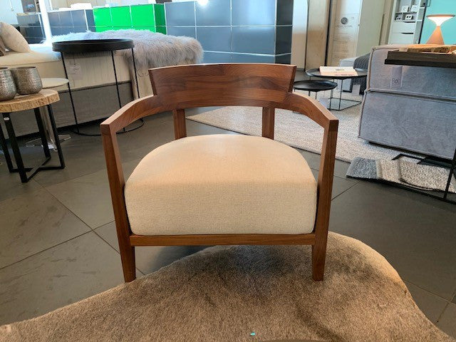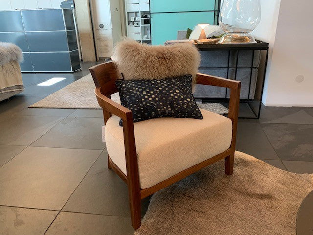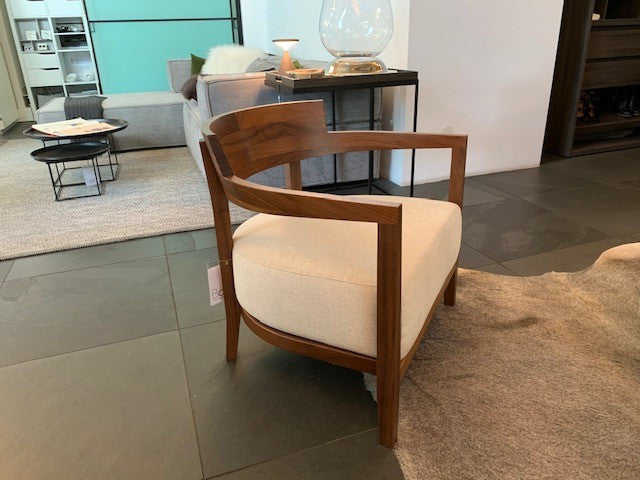 Das stabile Gestell aus hochwertigem Nussbaumholz verleiht dem Sessel Wärme und Eleganz und macht ihn zu einem stilvollen Blickfang in jedem Wohnraum.