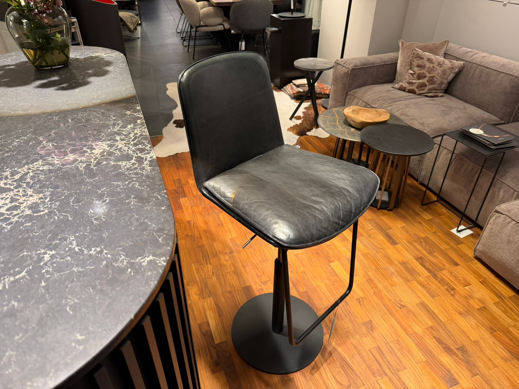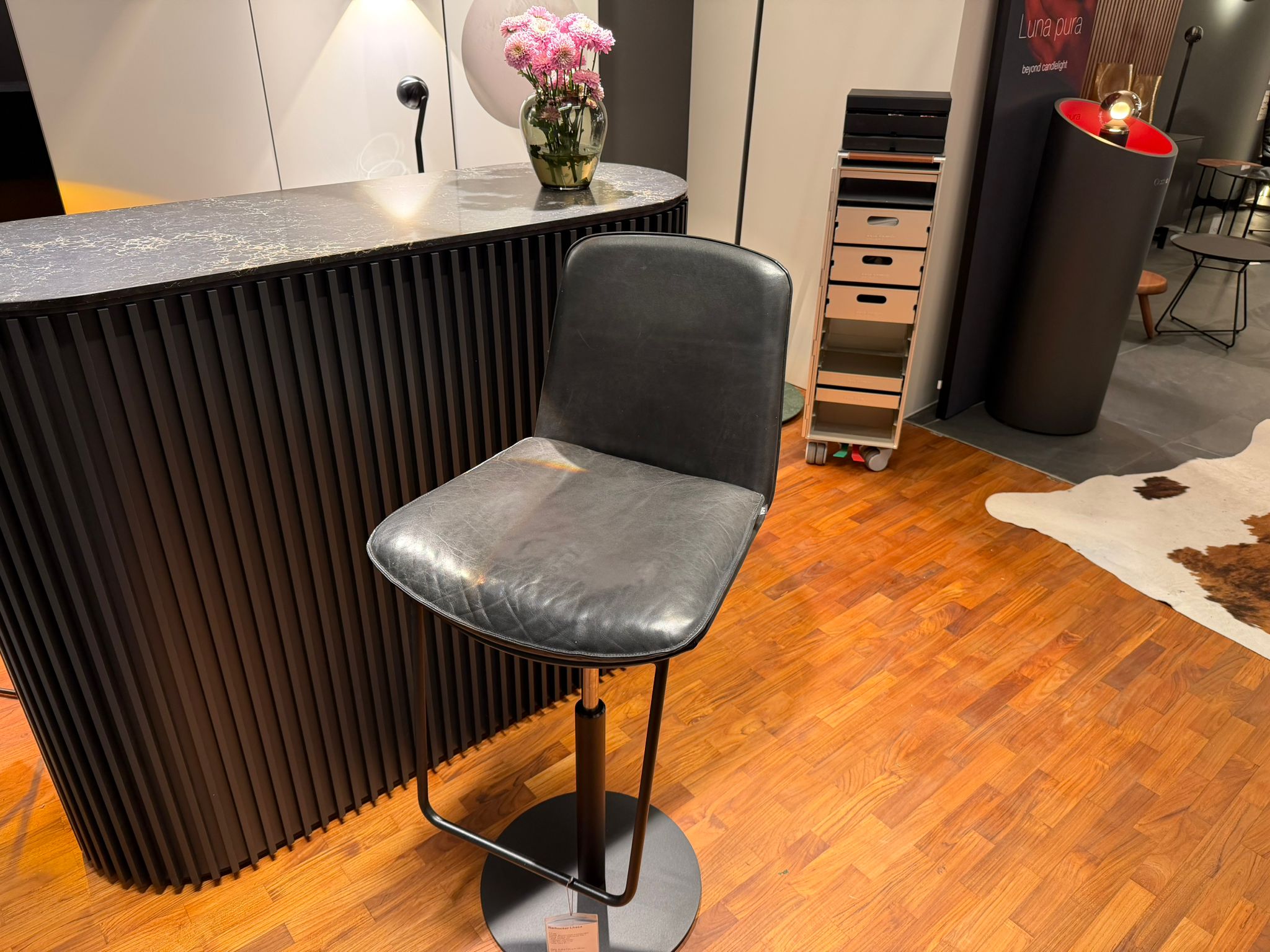 Bezogen ist der Hocker mit hochwertigem Leder in Schwarz, das elegante Gestell ist schwarz pulverbeschichtet. Besonders praktisch: Der Barhocker ist höhenverstellbar und passt sich flexibel jedem Tresen oder Bartisch an.